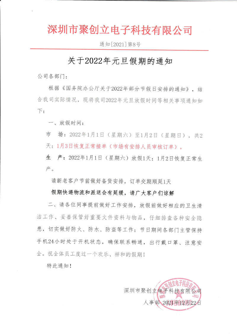 根據(jù)《國(guó)務(wù)院辦公廳關(guān)于2022年部分節(jié)假日安排的通知》,結(jié)合我司實(shí)際情況,現(xiàn)將我司2022年元旦放假時(shí)間等相關(guān)事項(xiàng)通知如下: